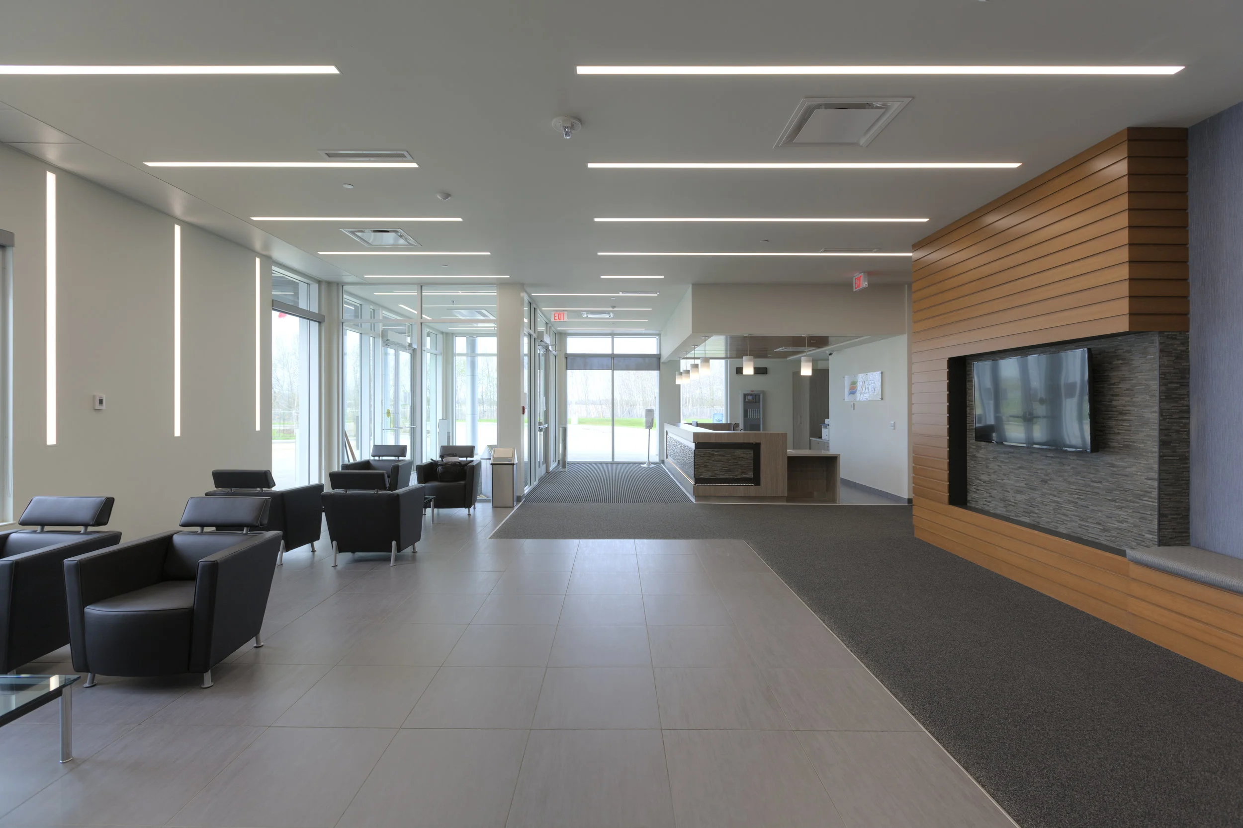 The Control and Administration building includes a large reception and waiting area, open and closed concept office spaces, meeting rooms and board rooms with views of the site, multiple kitchens including a dining hall, and a high tech control room. The Fire Hall and Maintenance building houses multiple bays for vehicle storage and maintenance, as well as office and training spaces.