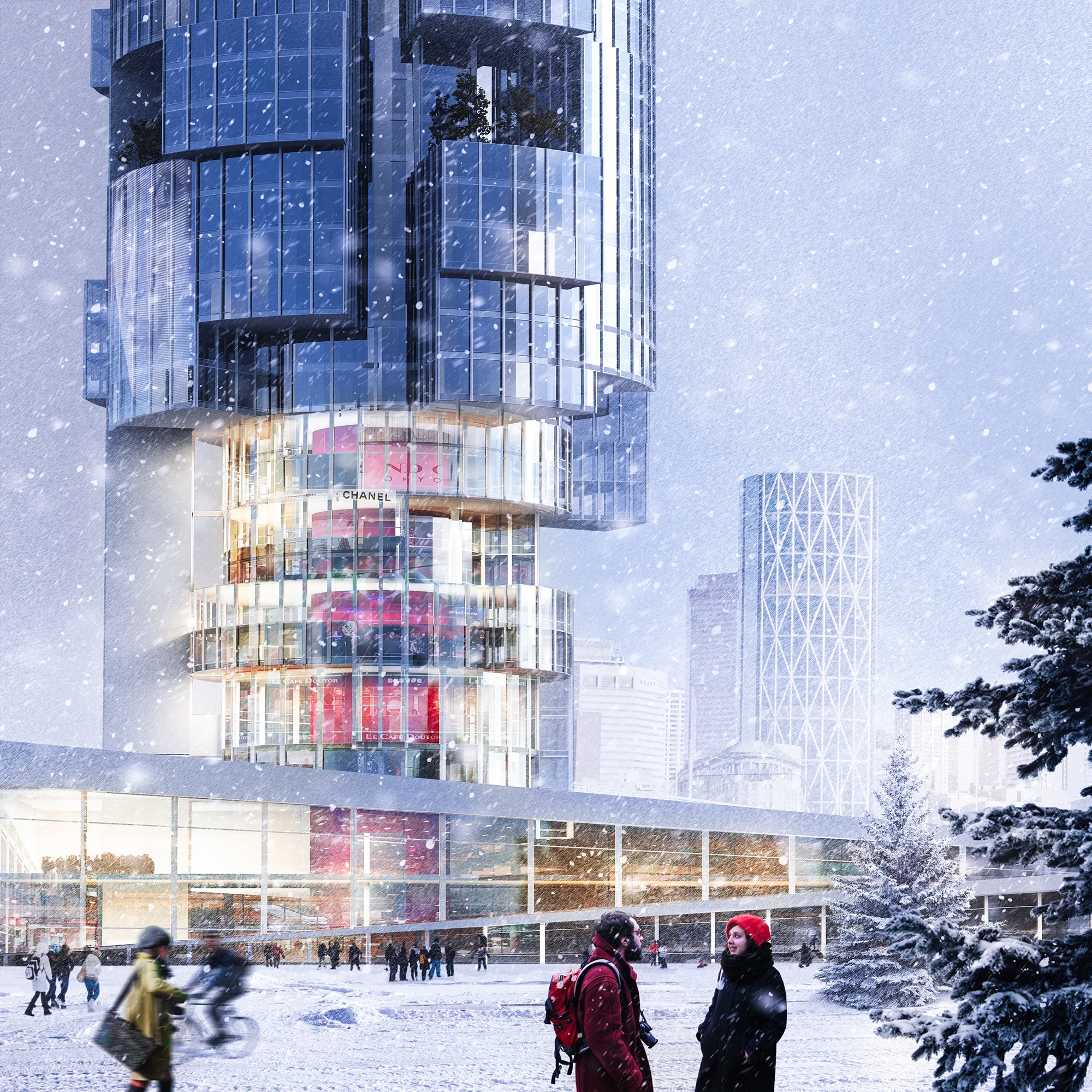 The Swarm Center operates as a primary agent within this new system. It will have the ability to operate not only as a local warehouse and distribution center, but also as an agile mixed use facility, offering retail fulfillment, entertainment, office, and residential solutions as well. The central core of the edifice is organized to integrate vertical warehousing. Vertical warehousing allows the network to maintain, monitor, and replenish inventory levels to retailers located at the base of the building. The ‘trade’ or retail area occupies the levels closest to grade or street. Proximity of retailers to the vertical warehouse will encourage retail environments to offer hybrid and create services such as the opportunity to make online purchases through kiosks in the store, or perhaps showroom material could be stored within the warehouse and retrieved in pre-arranged displays customers.